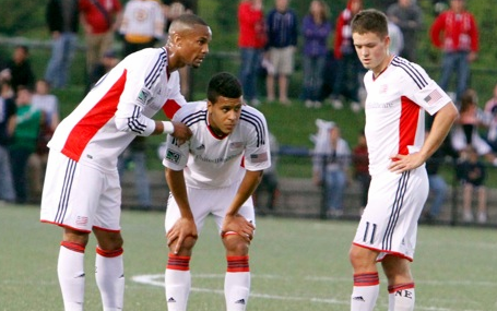 Darrius Barnes, Gabe Latigue and Kelyn Rowe discuss an upcoming free kick during last week’s Open Cup game against New York. (Photo: Chris Aduama/aduama.com)