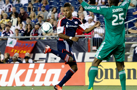 Juan Agudelo’s deft touch off a Chris Tierney long ball set up a sublime 54th minute goal in Saturday’s 2-0 win over Chicago. (Photo: Chris Aduama/aduama.com)