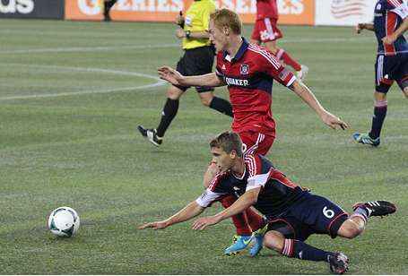 Scott Caldwell and Jeff Larentowicz battle for the ball during Saturday’s showdown between the Revolution and Fire. (Photo: Kari Heistad/capturedimages.biz)