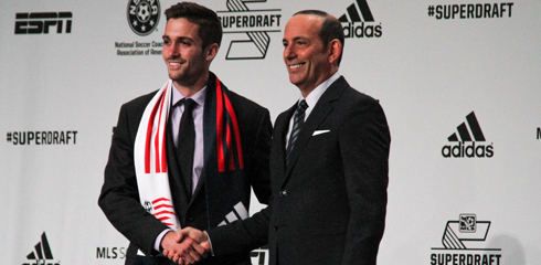 Steve Neumann poses with MLS Commissioner Don Garber after being selected fourth overall by the Revolution in the 2014 MLS SuperDraft. (Photo Courtesy MLSSoccer.com)