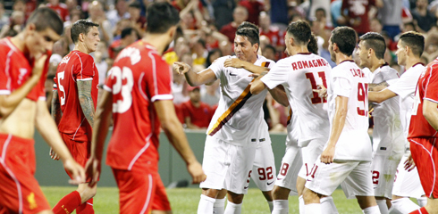 BOSTON, Mass. – AS Roma emerged victorious thanks to a 90th minute Marco Borriello shot and some help from a deflection off Daniel Agger to win the 2014 edition of Football at Fenway at historic Fenway Park in a sellout on Wednesday night.
